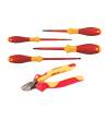 Juego de 5 Herramientas Aisladas a 1,000 V, Incluye: (2) Desarmadores planos: 1/8", 3/16"., • (2) Desarmadores cruz: #1, #2., • (1) Pinza de corte diagonal de 6-1/4"., Ventajas: Certificados a 1,000V., • Barra de Acero Cromo Vanadio Molibdeno., • Maneral SoftFinish ergonómico., WIHA.