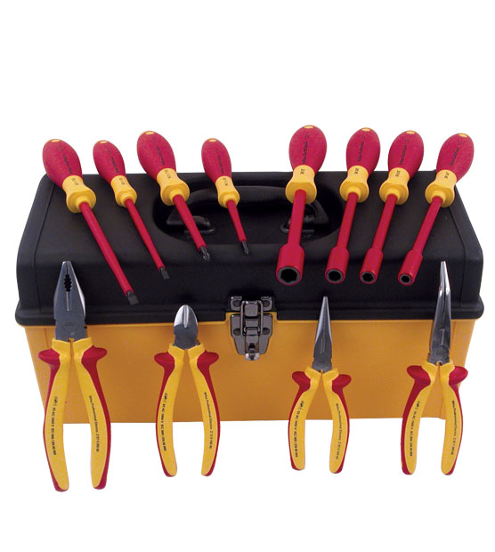 Juego de 8 Desarmadores y 4 Pinzas Aisladas, Incluye (1) Pinza Electricista 8" , (1) Pinza Puntas Largas 6", (1) Pinza Corte Diagonal 6", (1) Pinza Pela Cables 6", 2 Desarmadores Planos, 2 Desarmadores de Cruz, 4 Desarmadores de Caja, 1 Caja de Herramientas Plástica, WIHA
