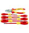 Juego de 7 Herramientas Aisladas a 1,000 V VENTAJAS: Probados individualmente a 10,000 V, Certificados a 1,000 V • Maneral Softfinish ergonómico • Pinza BiCut de alto rendimiento, sustituye a dos alicates, hasta un 50% menos de fuerza manual necesaria para cortar materiales extremadamente duros. • Forjados por estampación de Acero C70 de alta calidad INCLUYE: Pinza de corte diagonal Bicut de 8" • (3) Desarmadores planos: 1/8", 3/16" y 1/4" • (3) Desarmadores cruz: #0, #1, #2. WIHA